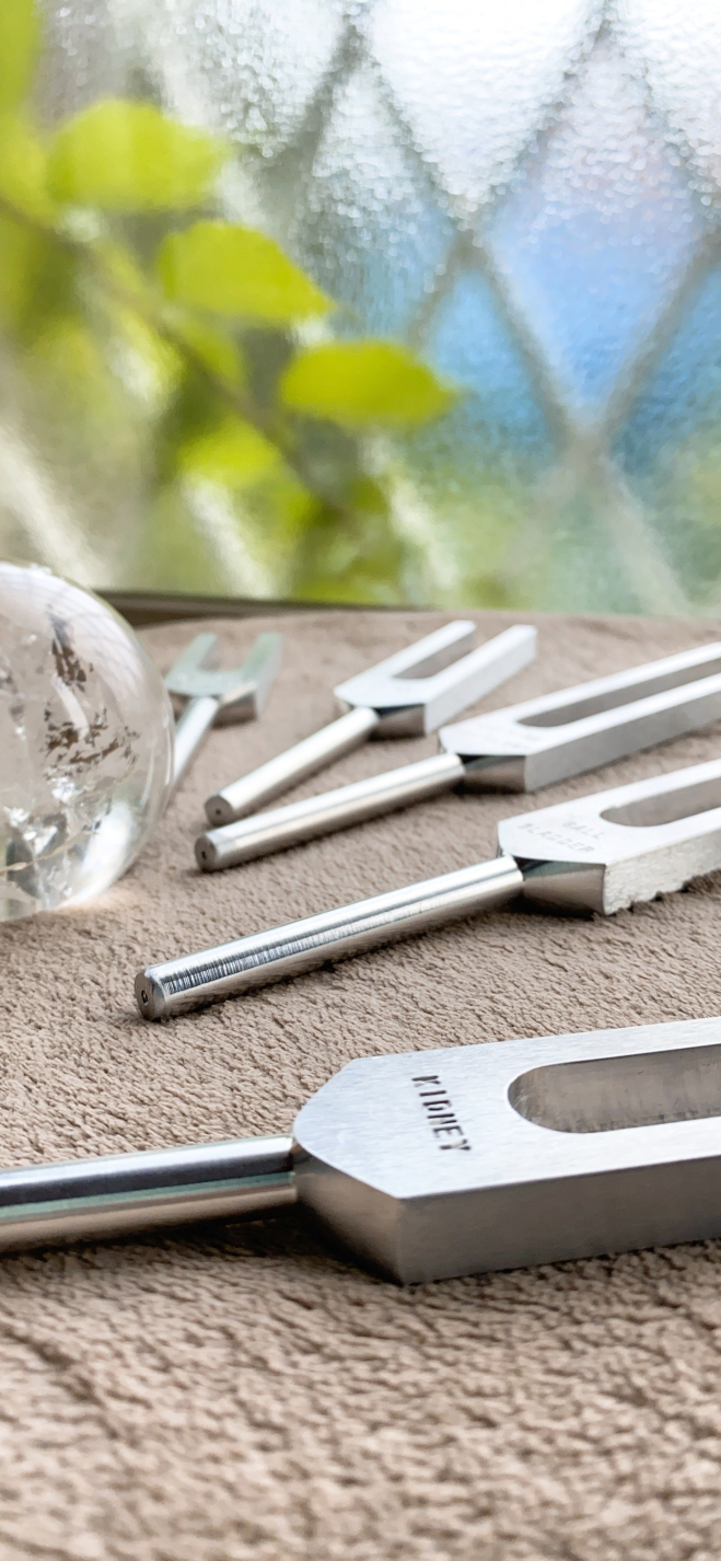 音叉ヒーリングは、体に対応した周波数のより、正しい波動で乱れたからだの状態を導き、それにより精神的疲労による自律神経のバランスの崩れの回復や、肉体的疲労による体の歪みの調整など、心と身体を音で癒やしながら整える事が出来ます。